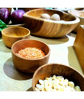 Set di quattro ciotole in legno di teak indonesiano 100% naturale da dieci centimetri di diametro. Delle mini bowls in legno perfette per impreziosire la tua tavola in modo originale. Le bowls sono realizzate interamente a mano utilizzando puro legno di teak naturale recuperando scarti di lavorazione.