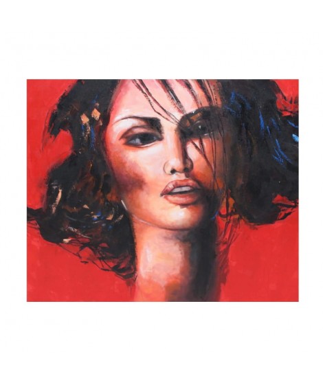 Quadro raffigurante un volto di donna con sfondo rosso sfumato. Dipinto interamente a mano il quadro è pronto da appendere e non necessita di cornice. Adatto ad ambienti in stile moderno è retrospillato e dipinto anche nelle parti esterne. Pezzo unico. Dimensione: 120X100